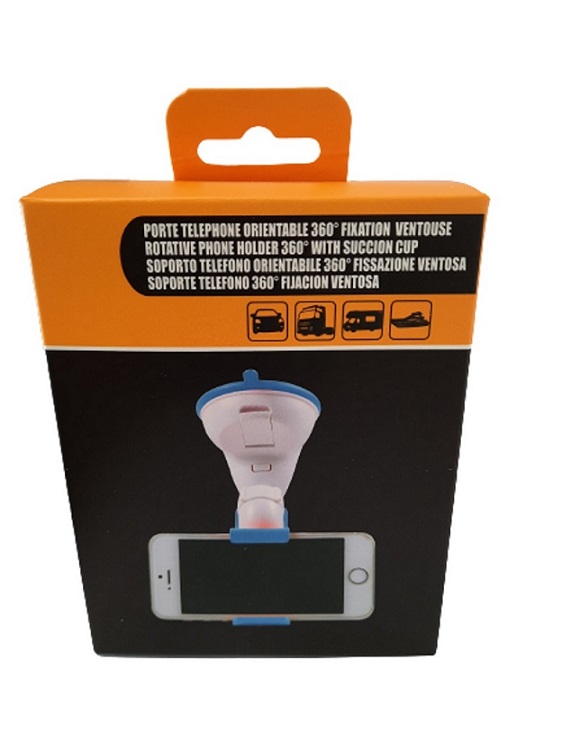 Fixation sur le pare brise ou le tableau de bord du véhicule par ventouse puissante. Ouverture maximale 110 mm