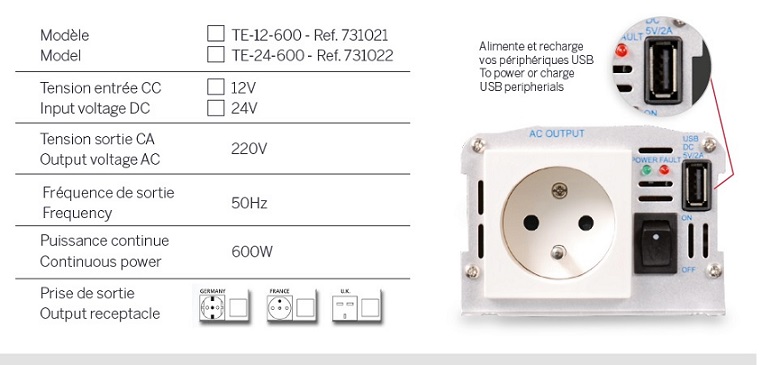 CONVERTISSEUR DE TENSION THOMSON 12V / 220V 600W AVEC PRISE USB-A 2A