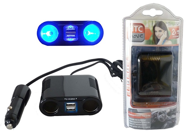 Double prise allume-cigare 12V /24V + 2 USB 2,1A max
