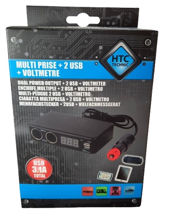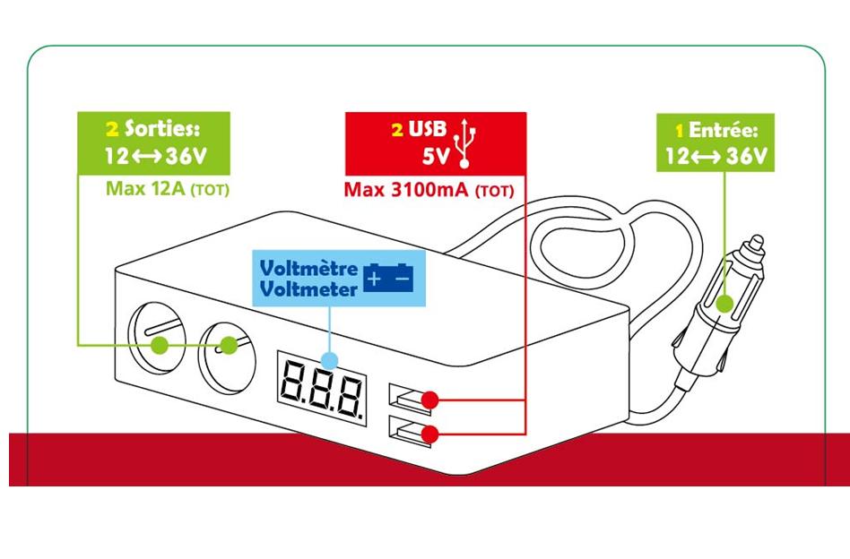 Multi prise allume-cigare 6A, 2USB 3,1A et voltmètre digitale pour le contrôle de la batterie et de l'alternateur.