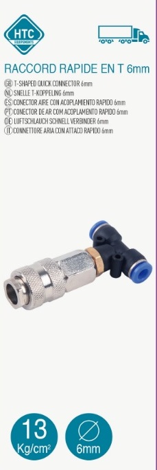Raccord rapide en forme de T, conçu spécifiquement pour une utilisation avec des soufflettes, doté d'une valve de fermeture automatique en bille de bronze.