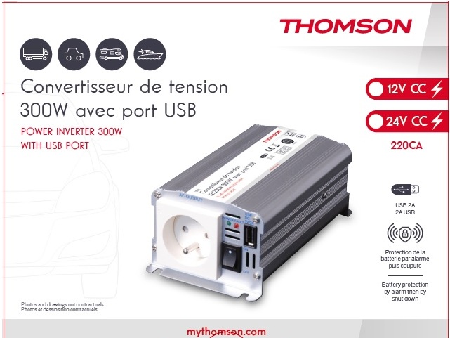 CONVERTISSEUR DE TENSION THOMSON 12V / 220V 300W AVEC PRISE USB-A 2A