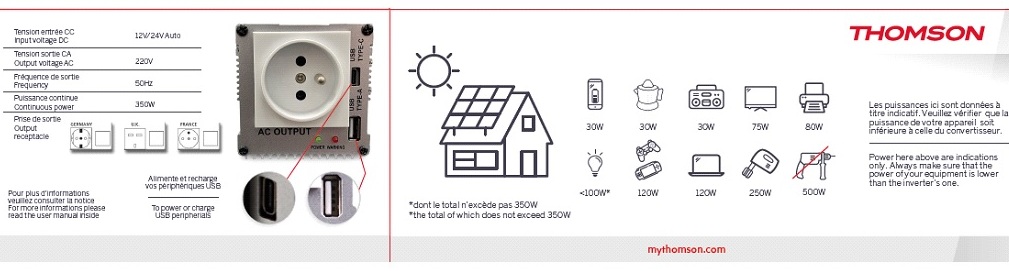CONVERTISSEUR 12V / 24V AUTOMATIQUE VERS 220V 350W AVEC PRISE USB-A QC3.0 18W ET PRISE USB-C PD30W