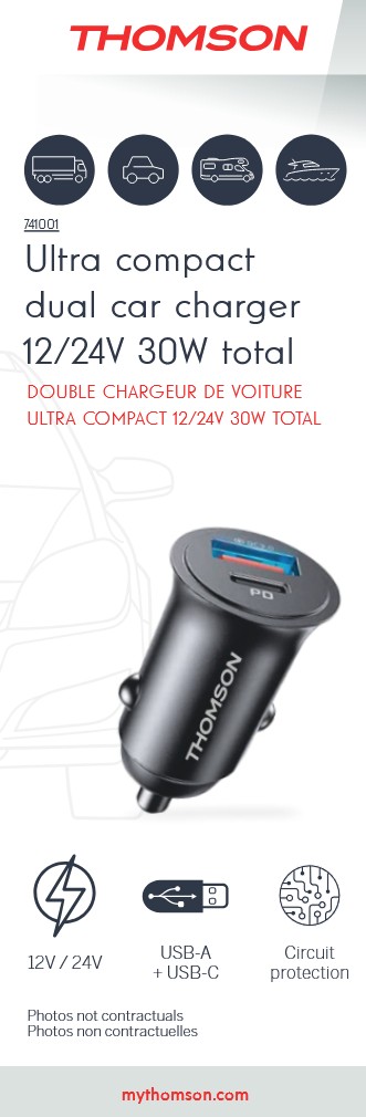 CHARGEUR DE VOITURE THOMSON ULTRA COMPACT 12/24V PD 20W QC 3.0 18W ( Total 30W)