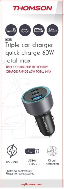 CHARGEUR DE VOITURE THOMSON 12/24V PD 30W + QC 3.0 18W (Total 60W )