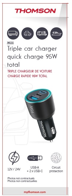 CHARGEUR DE VOITURE THOMSON 12/24V 2 USB-C PD 65W + PD 30W + QC 3.0 18W (Total 95W )
